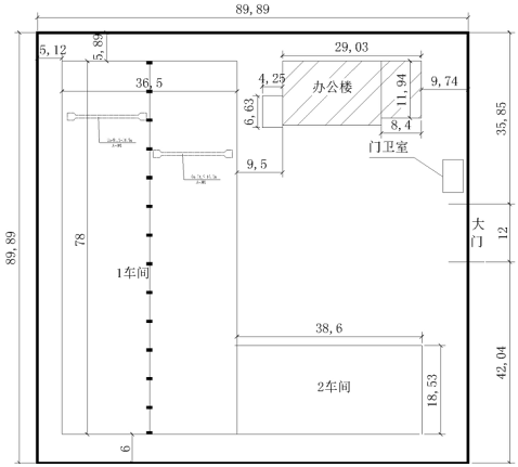 1号厂房长78米。宽36.5米。层高10.8米。面积2847平米。5吨天车2台。